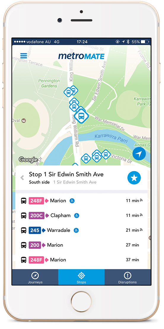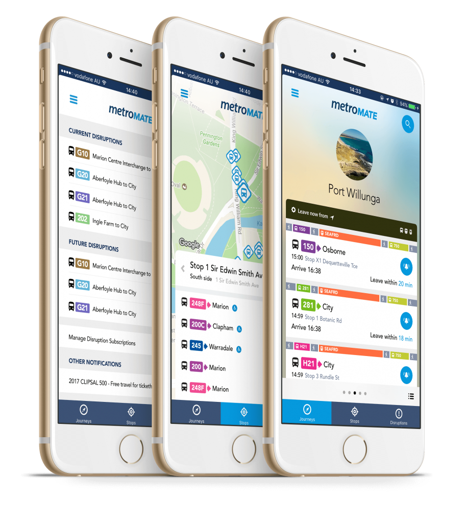 UX Design, App Design Creating a unique transport app in an extremely cluttered market was no simple task and to be honest we had to ask ourselves numerous times what a small 3 man team could do better than Google, Moovit or Apple Maps. With research, workshops and user feedback we worked closely with Adelaide Metro to design and develop cross-platform app MetroMATE. In just 3 months a road map of functionality was created and we embarked on a journey which led MetroMATE to become the second most downloaded transport app in the App Store. As with any ongoing app project we knew we needed to add in more mainstream features but for initial launch we concluded that to stand out from the crowd the app needed to cater not for the ‘power-user’ but the ‘average traveller’. Our goal was to try and make public transport easier for the people who find it a little daunting; those who don’t travel frequently or when they do, have to travel on multiple trains/buses to get them to their destination. The result was ‘Journey mode’. Many apps allow users to save their favourite destinations but ‘Journey Mode’ makes more of the destinations to create a colourful and unique home screen experience for the user. Within each destination screen, routes are cleanly laid out to show the changes and length of each step along the route; putting infrequent travellers at ease. JOURNEY MODE It was first released on iOS before Android, with a test audience that allowed us to modify any UX if required. This resulted in an simpler onboarding process and screen which allowed the user to quickly add all their frequently travelled to destinations. We also added another feature not included in more mainstream apps. ‘Leave notifications’ was a simple concept that allows people to set an alarm for when to leave and snooze if they choose to take a later journey. This small addition was extremely well received but of course with any app, the users always want more… NEARBY/STOPS MODE The roadmap for updates was planned out in sprints and over the course of a few months has had various major and minor updates including adding disruption information, push notifications, a much requested ‘nearby stops mode’, the ability to pay with your mobile, manage your metrocard and ‘live ride’ – a feature that helps infrequent, tourists or disabled travel easier. It also included designing a whole suite of custom Google Place iconography for use in-app. It was a great project to be a part of and look forward to seeing future updates that will make riding public transport smarter, quicker and safer. If you’re ever in Adelaide, download the App and give it a ride!