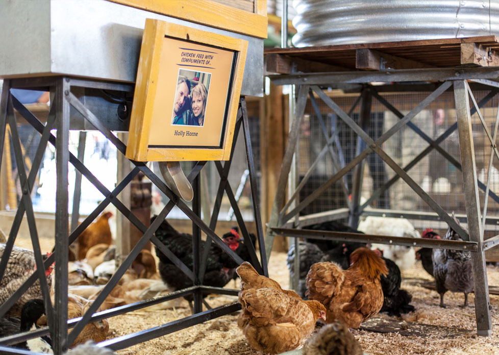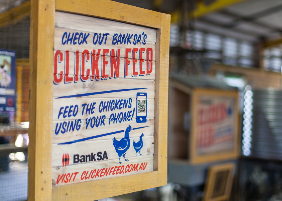 Clicken Feed Client: Bank SA Media: Activation, Interactive Tasked with activating Bank SA’s sponsorship of the Royal Adelaide Show while at the same time growing their Facebook fans we created ‘Clicken Feed’ – a giant vending machine for Chickens! People attending the show could feed the chickens in the BankSA sponsored farmyard nursery area simply by visiting BankSA’s facebook page and hitting like. The user’s profile picture was displayed on the screen above the chute for the chickens to show their gratitude. It was a fun event and became the talk of the town (or farmyard at least!).