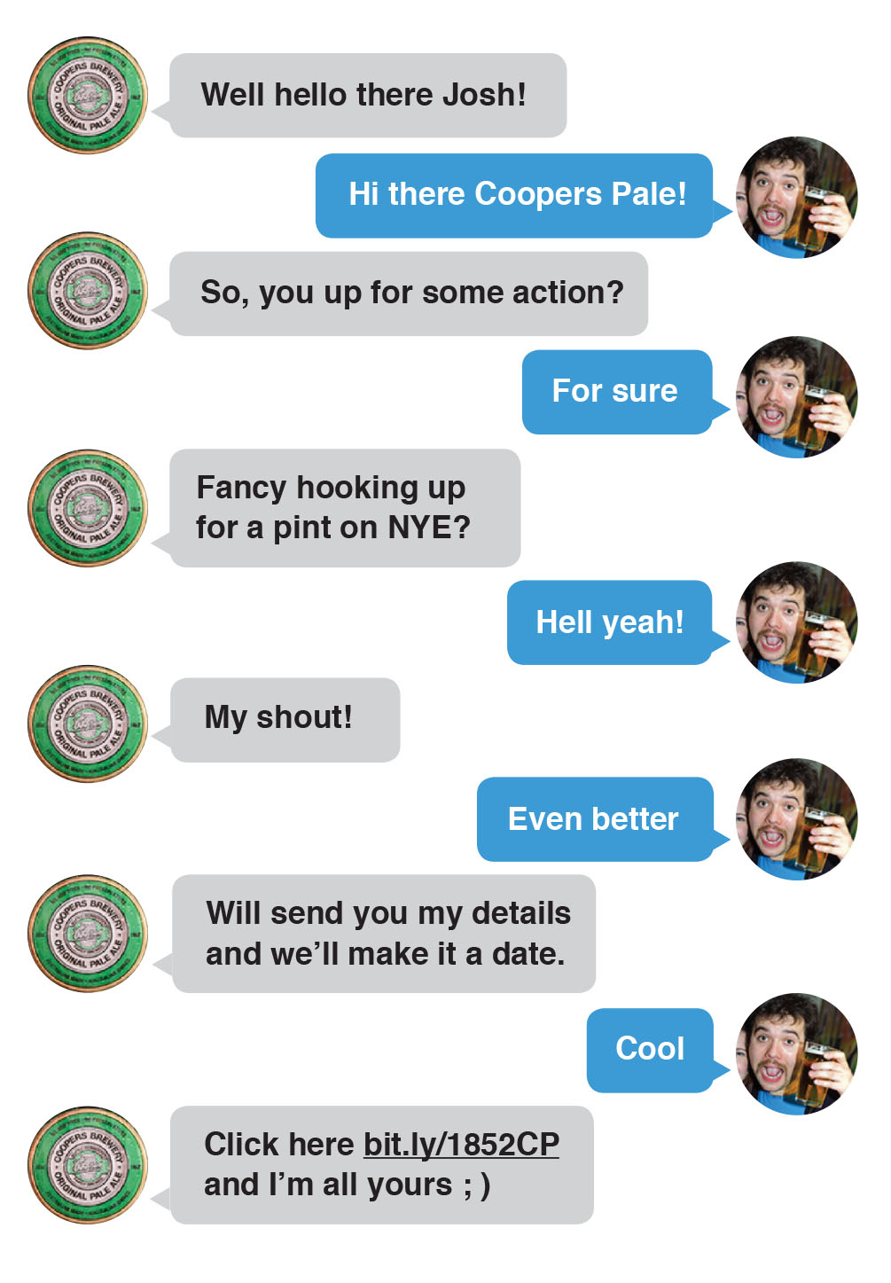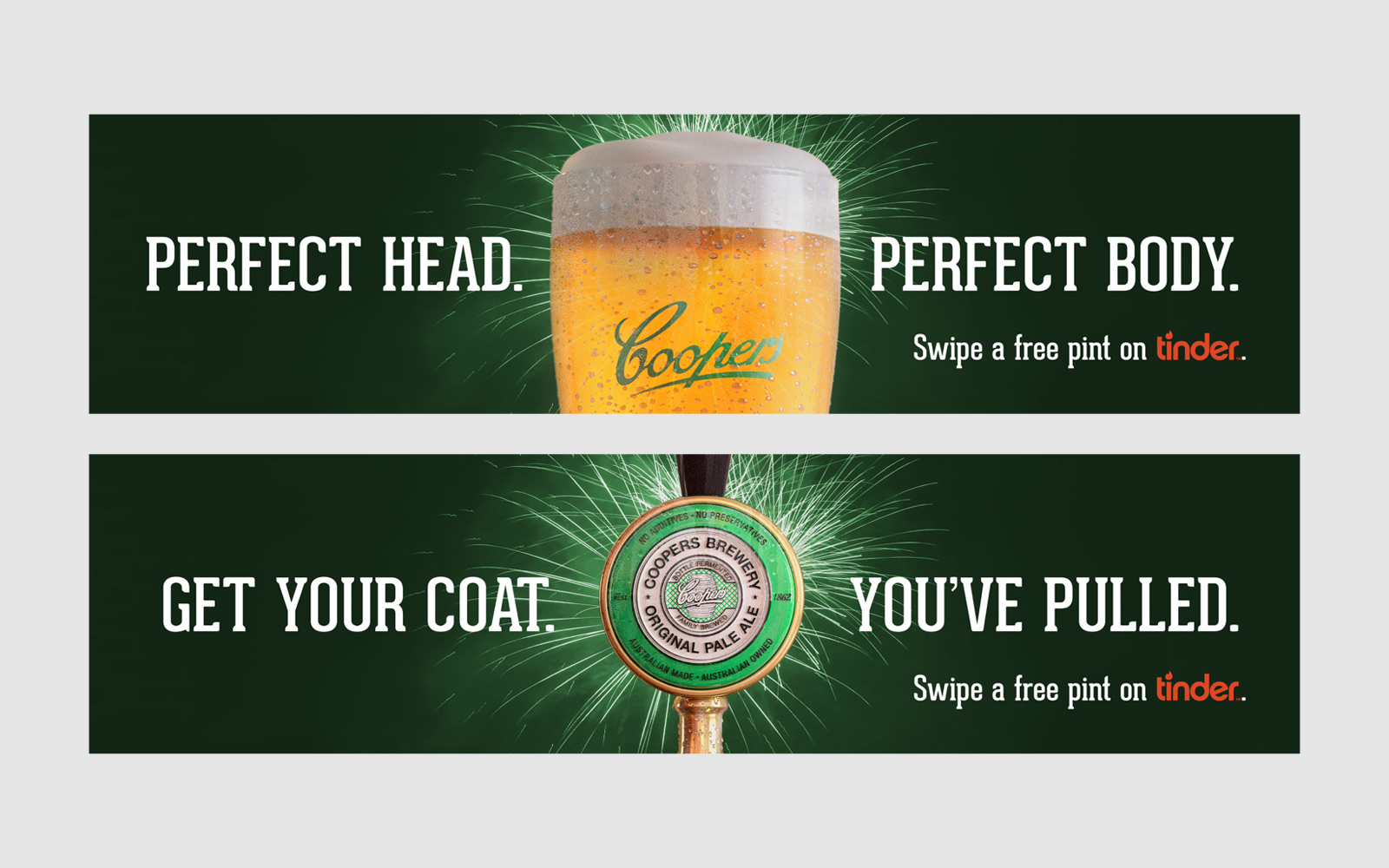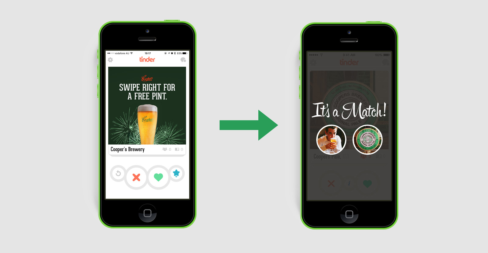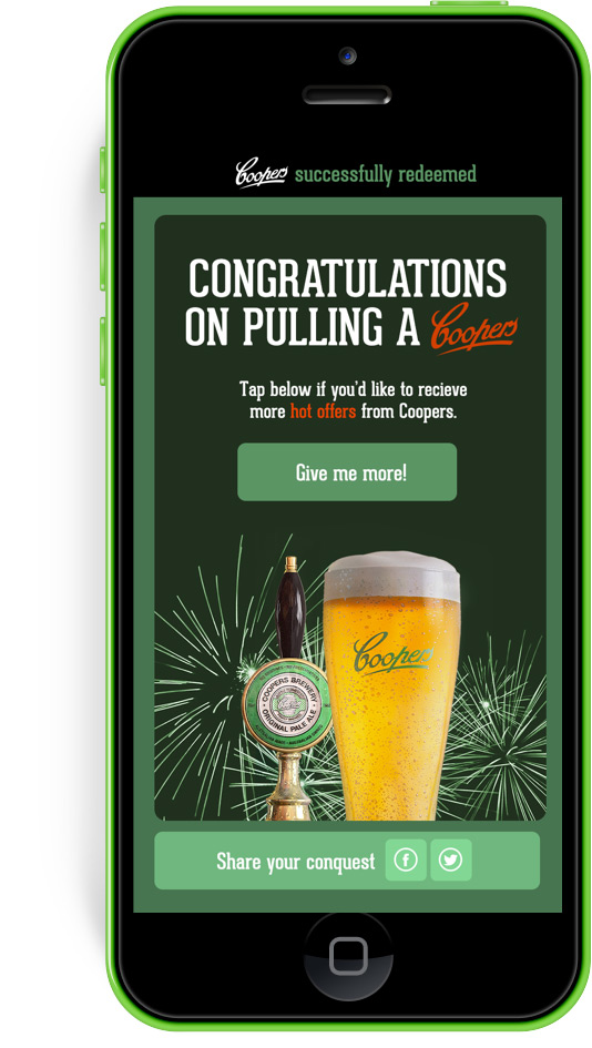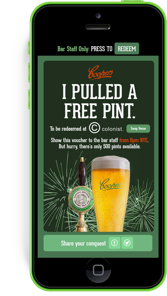 For two weeks prior to new years, each of Tinder’s million plus users would be served up a Coopers Pale Ale profile every time they logged in, and if they swiped right, they’d could be hooked up with a free pint of Pale Ale at participating venues.